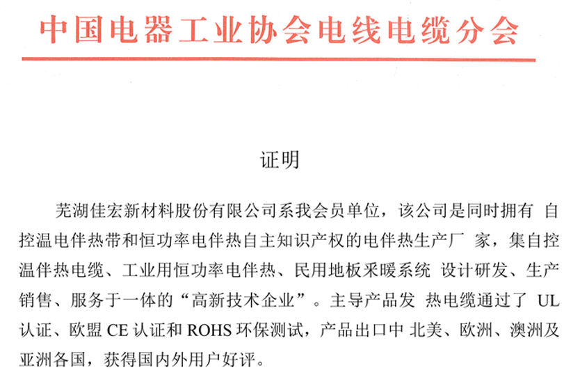 据芜湖佳宏新材料股份有限公司给予的“电伴热国内市场份 额分析"(基于销售额)以及由华普天健会计师事务所(容诚会计师 事务所)出具的近三年该公司审计报告,结合我会对相关行业情况的分析,我会釆信的佳宏新材料公司主导产品电伴热的市场占有率排 名为:芜湖佳宏新材料股份有限公司近三年主导产品电伴热在国内 细分市场占有率排名前三位。